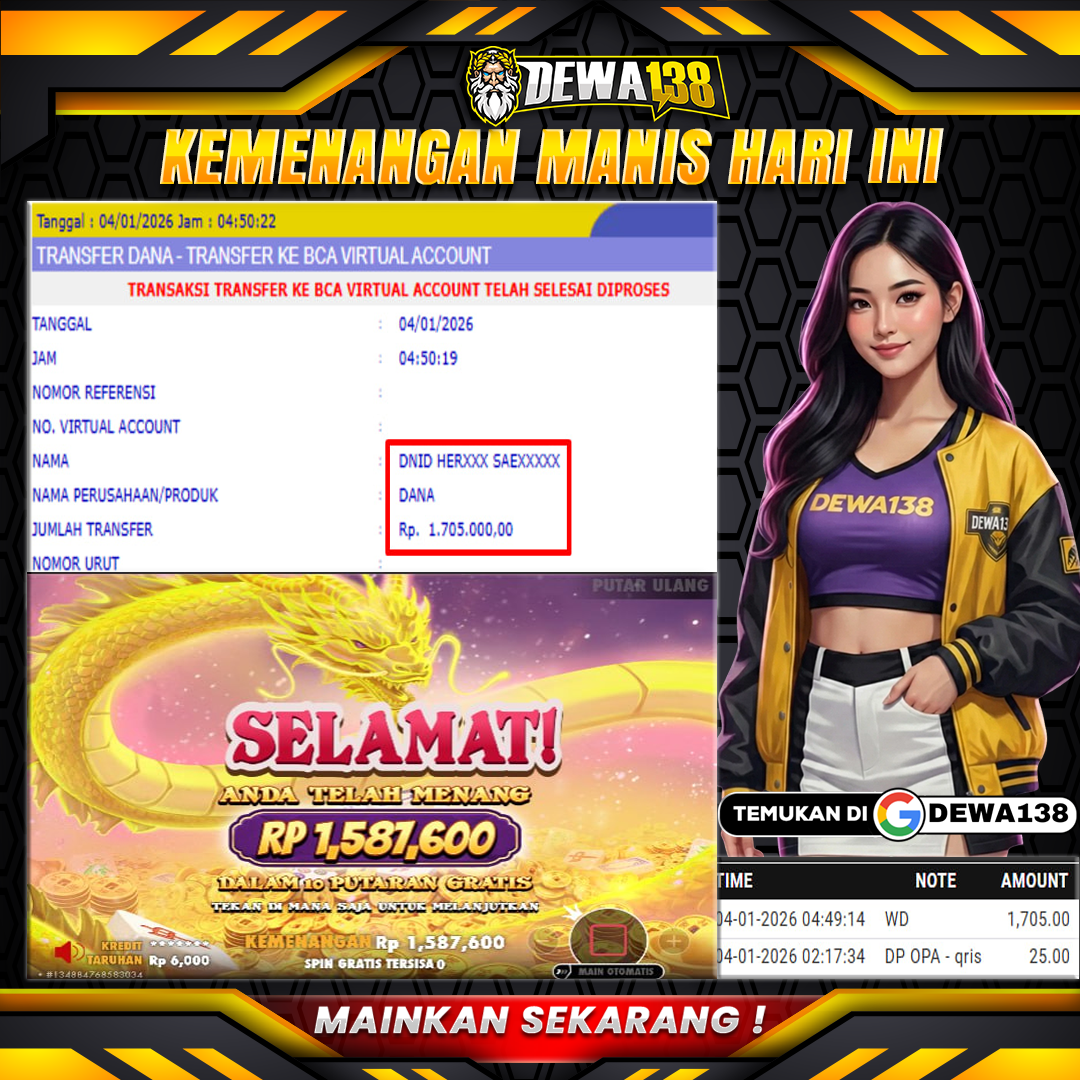 DEWA138 menghadirkan game jackpot vip yang di lengkapi fitur khusus new member hanya dengan modal deposit 25k dijamin akan withdraw 1,7 juta malam ini.